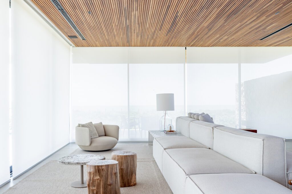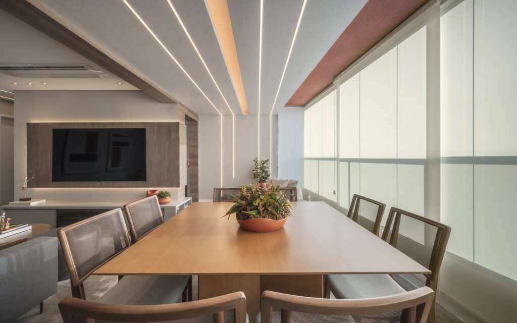 As lâminas horizontais e os tecidos translúcidos da Diamond permitem que a luminosidade incida no interior do ambiente de forma direcionada e suave. A estrutura funciona como um filtro para a luz, criando espaços com privacidade e elegância.